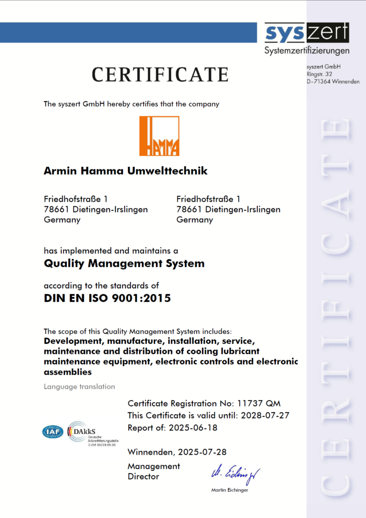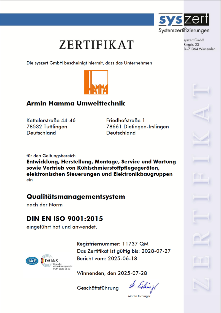 Seit 2002 steht Armin Hamma Umwelttechnik mit Sitz in Tuttlingen für Innovation, Qualität und Nachhaltigkeit in der Kühlschmierstofftechnik. Unsere Lösungen überzeugen durch hohe Leistungsfähigkeit, vielfältige Anwendungsmöglichkeiten und eine konsequente Ausrichtung auf die Anforderungen moderner Fertigungsbetriebe.