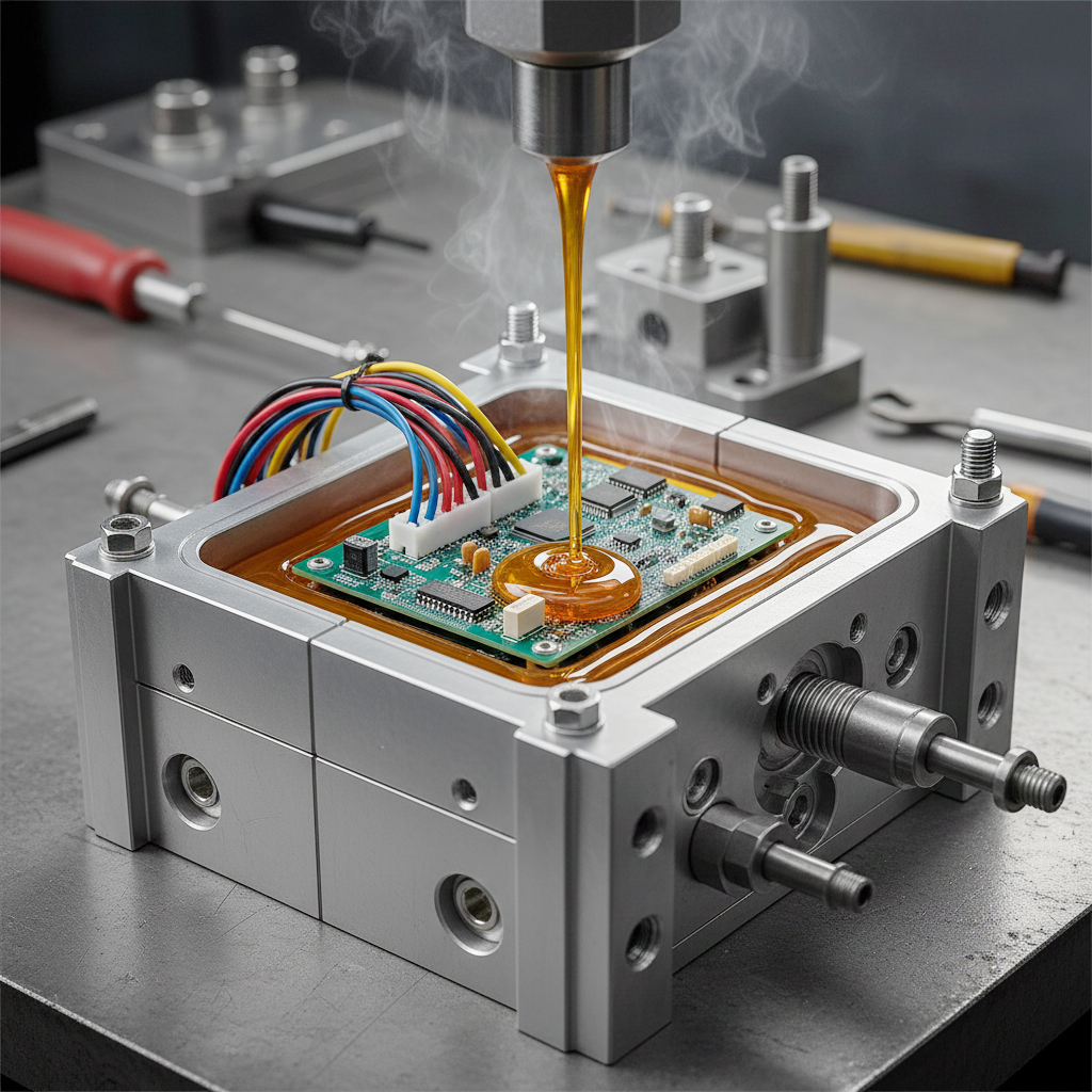 Es schützt empfindliche Bauteile wie Elektronik, Steckverbindungen und Kabelenden durch Umspritzen bei niedriger Temperatur und Druck.